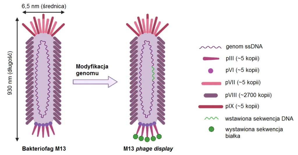 Bakteriofag M13 należy do filamentujących fagów, posiada jednoniciowy genom DNA, a jego kapsyd zbudowany jest z pięciu różnych białek. Technologia phage display polega na modyfikacji genomu faga poprzez wstawienie obcej sekwencji do genu białka kapsydu, co umożliwia prezentację obcego peptydu lub białka na powierzchni wirionu [Rycina z artykułu Jaroszewicz et. al., 2022, zmienione].